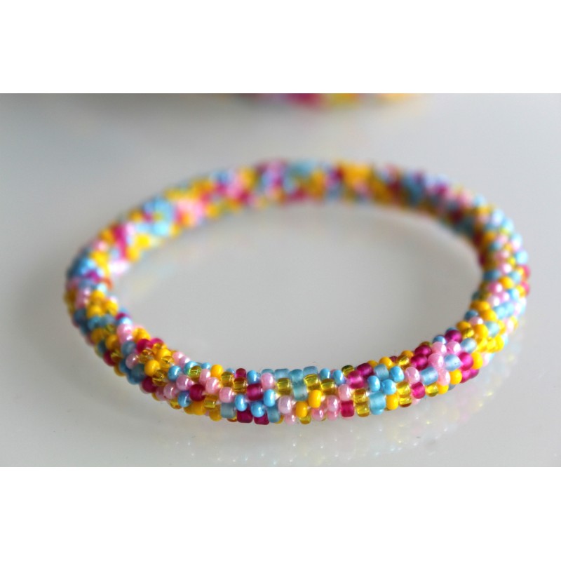Schönes Armband, handgefertigt von Frauen in Nepal. Die Armbänder bestehen aus kleinen Glasperlen, die zuerst auf eine Schnur aufgefädelt werden und dann gehäkelt werden. Die kleinen Perlen müssen in einer ganz bestimmten Reihenfolge aufgefädelt werden, damit später das schöne Muster entsteht.